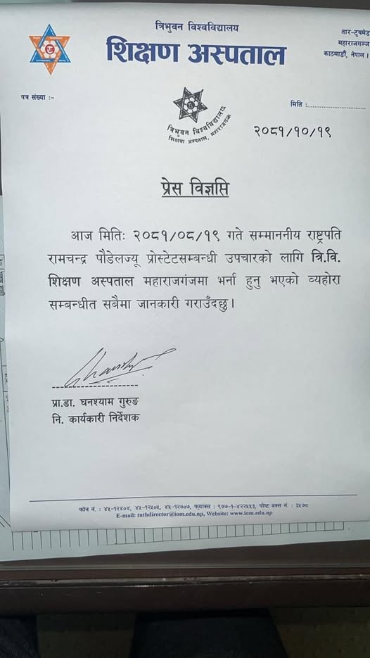 राष्ट्रपति रामचन्द्र पौडेल अस्पताल भर्ना पोस्टेटको अपरेशन हुँदै १ साल अगाडी jayjanata tv 42 42Shares 42 42Shares बुधबार १९ मङ्सिर २०८१ काठमाडौं / राष्ट्रपति रामचन्द्र पौडेल पोस्टेटको कारण त्रिवि शिक्षण अस्पताल महाराजगञ्जमा भर्ना भएका छन्। बुधबार विहान अस्पताल भर्ना भएका राष्ट्रपति पौडेलको पोस्टेटको अपरेशन भइरहेको छ। वहाँलाई ७:३० बजेदेखि पोस्टेटको अपरेशन सुरु गरिएको हो। WRITE COMMENTS FOR THIS ARTICLE 0 0 votes Article Rating Subscribe Login Notify of new follow-up comments new replies to my comments Label {} [+] Name* Email* Website Label {} [+] Name* Email* Website 0 Comments Inline Feedbacks View all comments RELATED NEWS ARTICLES देवकुमारी चौधरीले बाढीपीडितलाई गरे राहत सामाग्री सहयोग माओवादी केन्द्रका नेता दिनेश किराती आजपामा प्रवेश प्रधानमन्त्री आज विभिन्न कार्यक्रमको लागि बारा र महोत्तरी जाँदै सिंहदरबार छिर्न पहुँचवालाको सिफारिस नचाहिने : गृहमन्त्री संगीत संयोजन विजय चौधरीको संयोजनमा थारु गीत ‘लहान बजारमे’ सार्वजनिक नेपाल प्रहरीका ८ जना डीएसपीबाट एसपीमा बढुवा ( सुचिसहित) दशैँको टीका, जमरा र आशीर्वाद लिनेक्रम आजपनि जारी टी-२० : उद्घाटन खेलमा क्यानडाले अमेरिकाविरुद्ध ब्याटिङ गर्दै आज गाई पूजा,गाईलाई मीठो खानेकुरा खान दिएर मनाइँदै