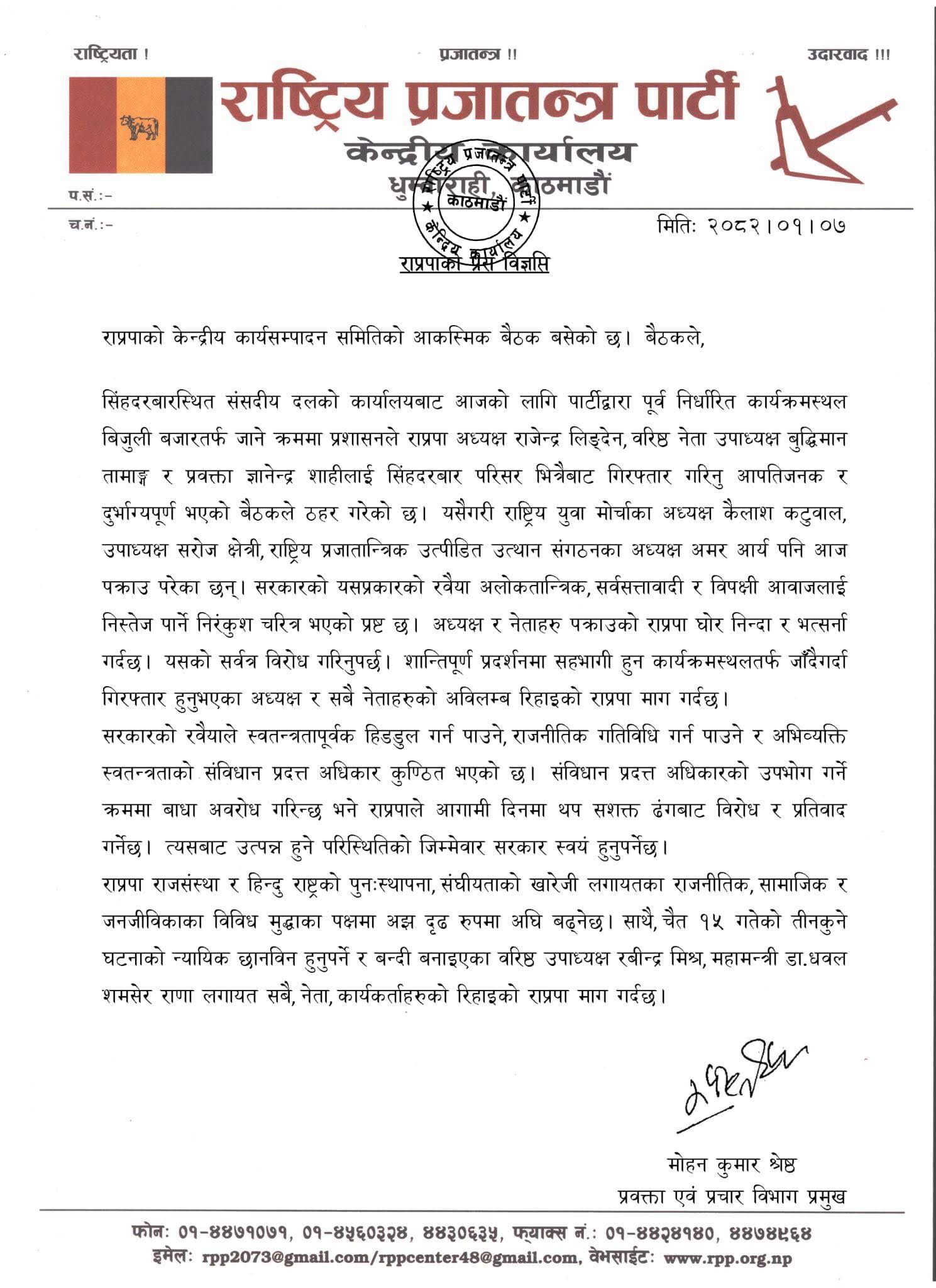 राप्रपाले राजसंस्था र हिन्दु राष्ट्रको पुनःस्थापना, संघीयताको खारेजी लगायतका राजनीतिक, सामाजिक र जनजीविकाका विविध मुद्दाका पक्षमा अझ दृढ रुपमा अघि बढ्ने राप्रपा प्रवक्ता मोहन कुमार श्रेष्ठले जारी गरेको विज्ञप्तिमा उल्लेख छ।