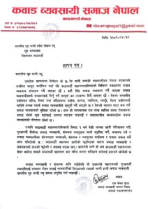 मन्त्रीसमक्ष उनीहरुले बुझाएको ज्ञापनपत्रमा भनिएको छ, ‘उपरोक्त सम्बन्धमा निवेदन यो छ कि हामी कवाडी व्यवसायीहरु नेपाल सरकारको प्रचलित कानून बमोजिम दर्ता रहि काठमाडौँ महानगरपालिकाको विभिन्न वडाहरुमा कवाड व्यवसाय संचालन गर्दै आएका छौ । बर्षौ देखि कवाड व्यवसाय गर्दै आएका कवाड व्यवसायीहरुले सरकारलाई तिर्नु पर्ने सम्पुर्ण कर (राजस्व) तिर्दै आएका छौं । देशमा संचालीत उद्योगहरु स्टील, वियर तथा मदिराजन्य उद्योग, कागज, प्लाष्टिक, ब्याट्री, मेटल उद्योगलाई चाहिने कच्चा पदार्थ कवाड व्यवसायीले आपूर्ती गर्दै आएको छ र देशको व्यापार घाटा कम गर्न कवाड व्यवसायको भुमिका रहेको छ । हाल यो व्यवसायमा एक लाख मानिस प्रतक्ष रोजगारमा आवद्ध रहेको कुरा यहाँलाई अवगत गराउन चाहन्छौं र वातावरणीय सरसफाईमा कवाड व्यवसायको योगदान रहेको छ ।’