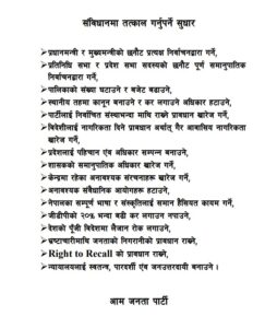 नेपालका सम्पूर्ण भाषा र संस्कृतिलाई समान हैसियत कायम गर्नुपर्ने, भ्रष्टाचारीमाथि जनताको निगरानीको प्रावधान राख्ने, राईट टु रिकलको प्रावधान राख्नुपर्ने र न्यायालयलाई स्वतन्त्र, पारदर्शी एवं जनउत्तरदायी बनाउने काम गर्नुपर्ने माग आजपाले अगाडी सारेको छ ।