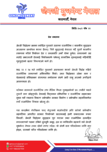 काठमाडौँ / जेन्जी विद्रोहका क्रममा नवोदित पुस्ताले उठाएका राजनीतिक तथा शासकीय मुद्दाहरू अझै सम्बोधन नभएको भन्दै जेन्जी मुभमेन्ट नेपालले वर्तमान अवस्थामा पुरानै शासकीय स्वरूपमा गरिने निर्वाचन देश र जनताप्रति धोका हुने चेतावनी दिएको छ। मुभमेन्टले समस्याको जड नछोई जबरजस्ती देशलाई निर्वाचनतर्फ लैजानु सामाजिक द्वन्द्वलाई गहिर्याउँदै गृहयुद्धको जोखिम निम्त्याउने कार्य हुने दाबी गरेको छ।
