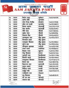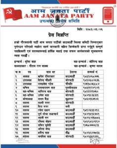 आम जनता पार्टी (आजपा) ले आफ्नो संगठन विस्तार र सुदृढीकरण अभियान अन्तर्गत काठमाडौं जिल्ला कमिटी पुनर्गठन गरेको छ। शनिबार सार्वजनिक गरिएको विवरण अनुसार खगेश रन्जितकार को अध्यक्षतामा ५७ सदस्यीय नयाँ कार्यसमिति चयन गरिएको हो।