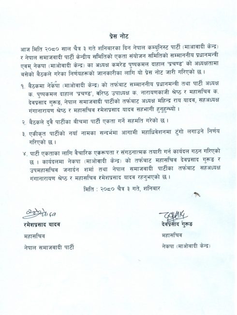‘बैठकले दुवै पार्टीका बीचमा पार्टी एकता गर्ने सहमति गरेको छ’ बैठक पछि जारी प्रेस नोटमा भनिएको छ, ‘पार्टीको नयाँ नामको सन्दर्भमा आगामी महाधिवेसनमा टुंगो लगाउने निर्णय गरिएको छ ।’