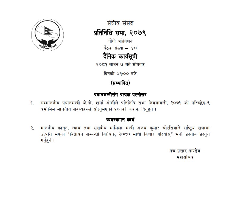 आजको प्रतिनिधिसभा बैठकमा कानुन, न्याय तथा संसदीय मामिलामन्त्री अजय चौरसियाले राष्ट्रिय सभामा उत्पति भएको विधायनसम्बन्धी विधेयक २०८० माथि विचार गरियोस् भनी प्रस्ताव पेश गर्ने समेत सम्भावित कार्यसूची रहेको छ।
